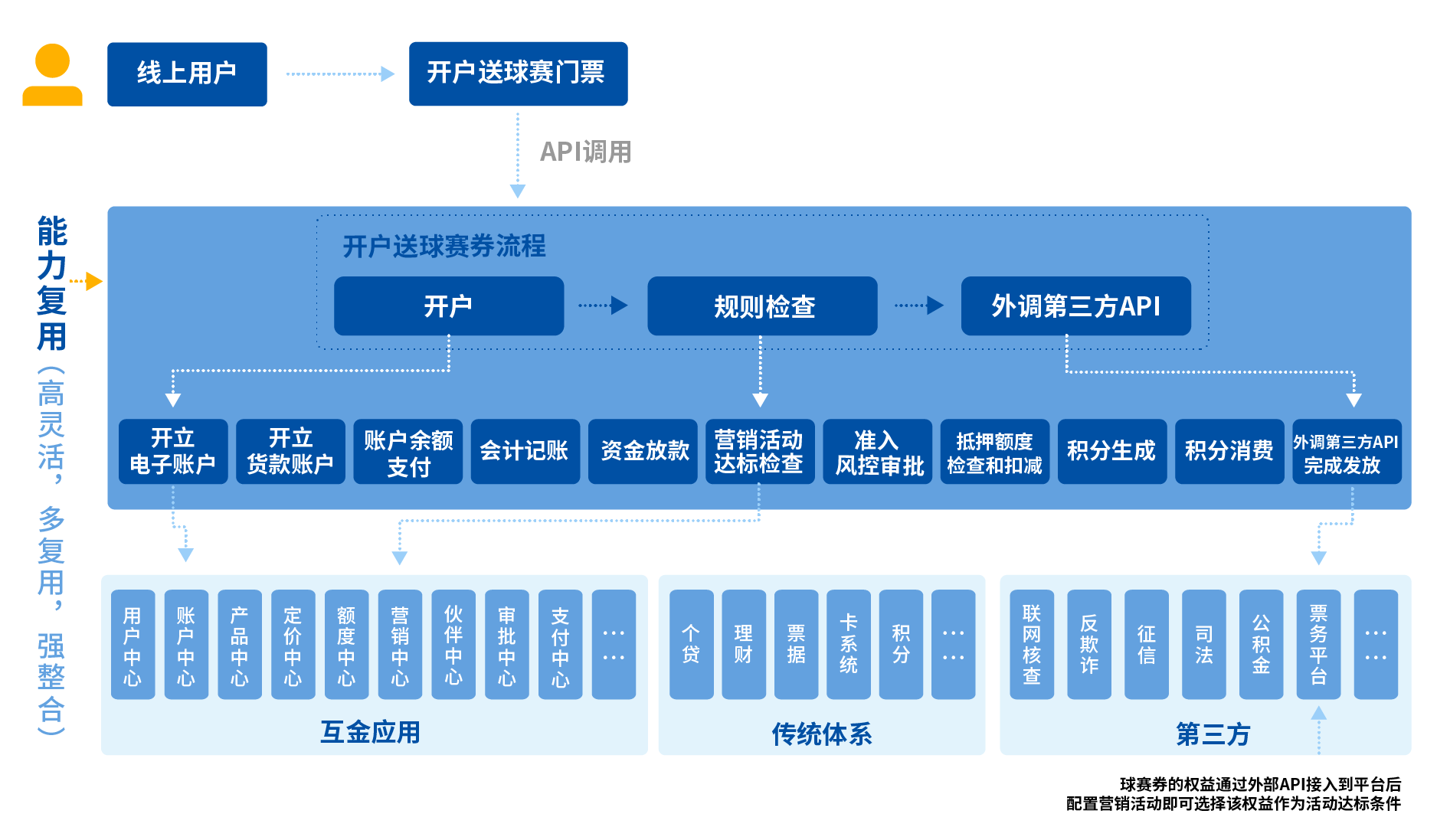 以開(kāi)戶送球賽門票為例:通過(guò)流程編排服務(wù),組合賬戶中心的開(kāi)立電子賬號(hào)的API接口、營(yíng)銷中心的營(yíng)銷活動(dòng)達(dá)標(biāo)檢查接口、票務(wù)平臺(tái)的第三方API接口這三個(gè)服務(wù),共同實(shí)現(xiàn)開(kāi)戶送球賽門票的場(chǎng)景。