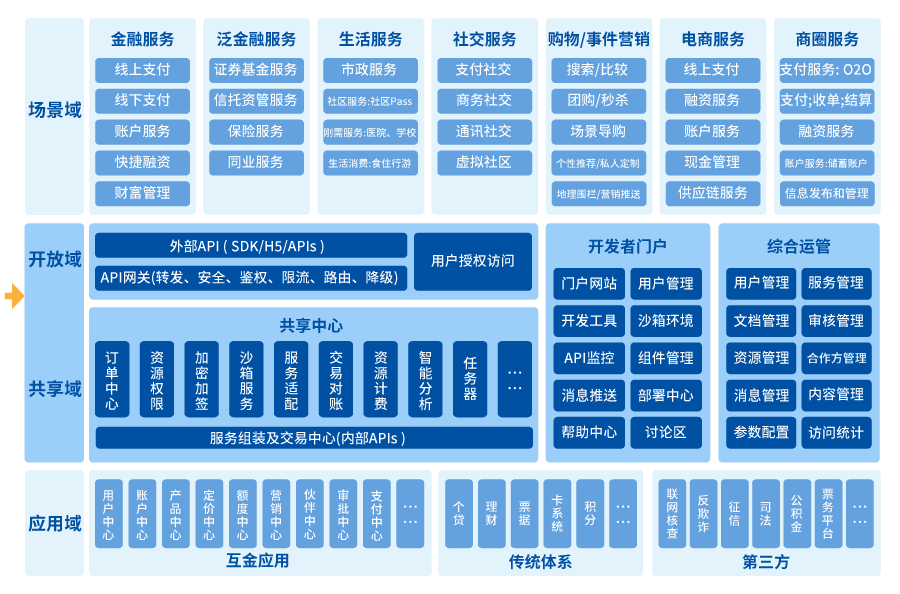長(zhǎng)亮科技開(kāi)放平臺(tái)通過(guò)共享域來(lái)整合應(yīng)用的金融能力,通過(guò)開(kāi)放域來(lái)將金融能力輸出給場(chǎng)景方。